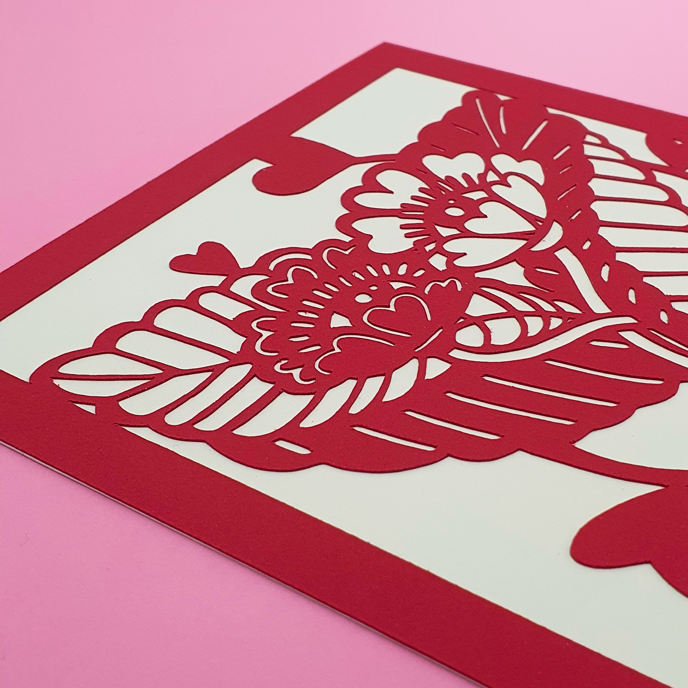 Cette illustration carrée en papier de 15×15 cm, est faite de 2 couches successives de papier de 270 gr PEFC fabriqué en France. Une couche découpée rouge intense sur une couche ivoire. Les découpes sont mécaniques et manuelles, le tout est assemblé à la main en petites séries.