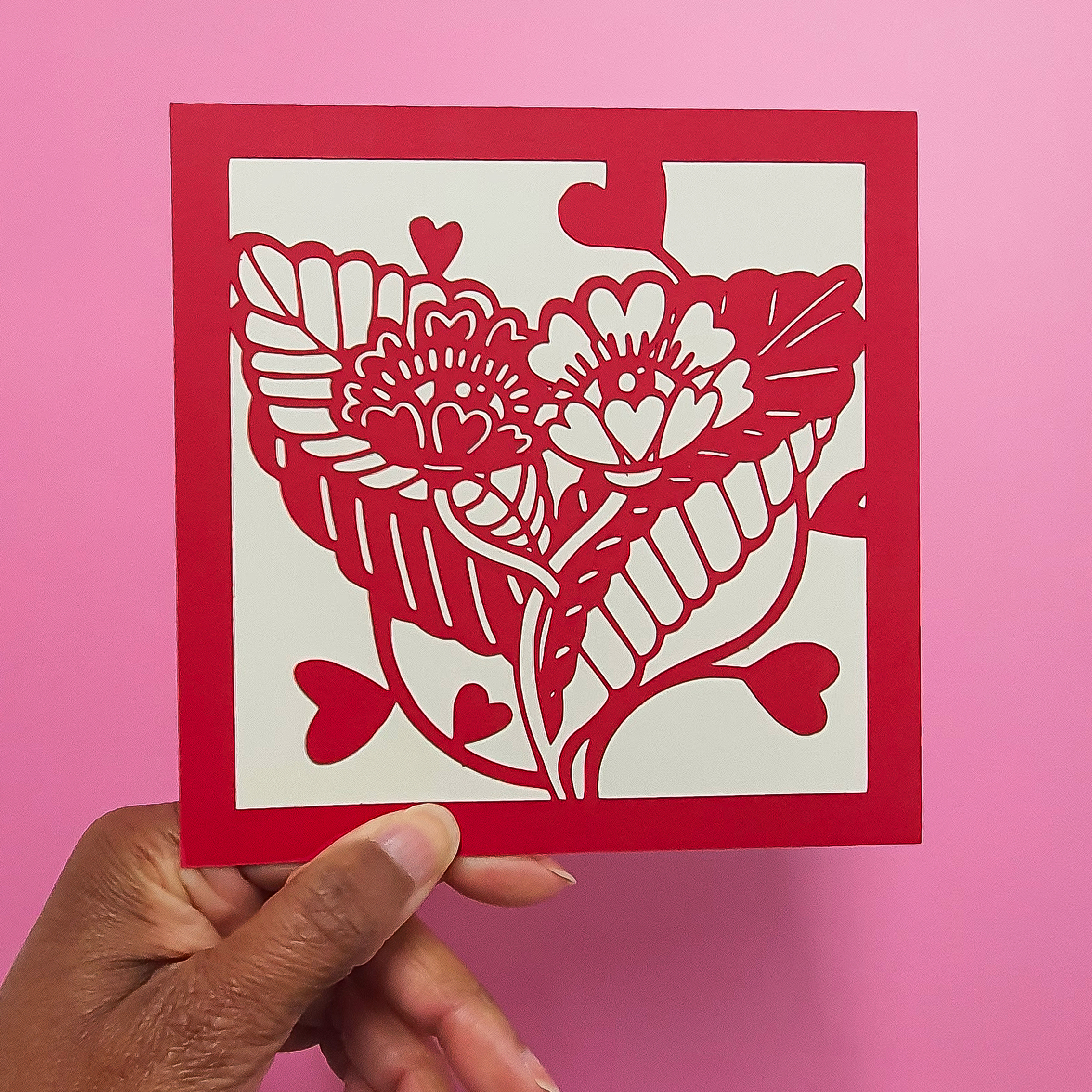 Cette illustration carrée en papier de 15×15 cm, est faite de 2 couches successives de papier de 270 gr PEFC fabriqué en France. Une couche découpée rouge intense sur une couche ivoire. Les découpes sont mécaniques et manuelles, le tout est assemblé à la main en petites séries.